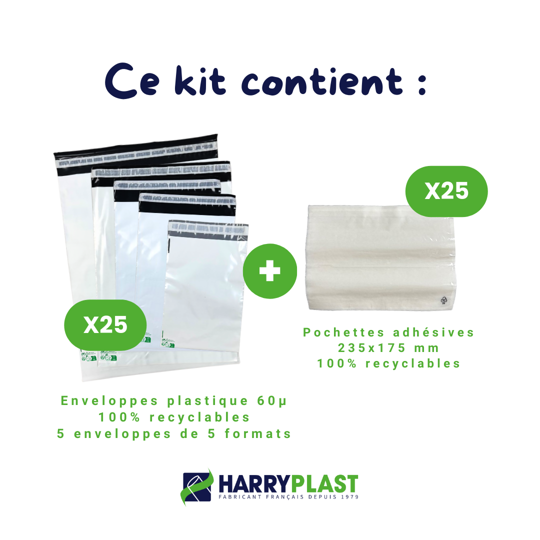 → Quantité d’emballages : 25 enveloppes + 25 pochettes transparentes adhésives