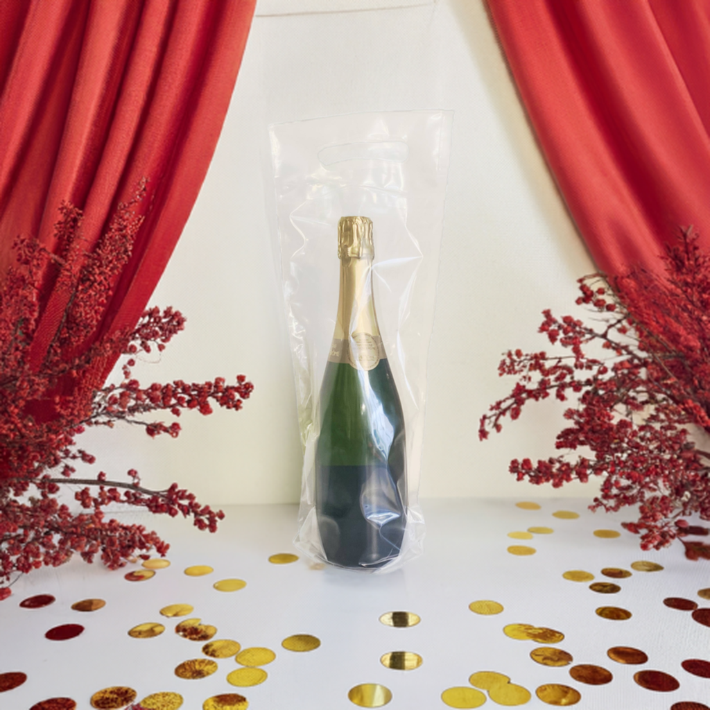 Transportez facilement vos bouteilles grâce à ce sac en plastique doté d’une poignée découpée pratique. Parfait pour le champagne, vin, whisky, apéritifs, digestifs, cidres, bières, limonades, sirops, jus ou encore huiles d’olive, il offre une solution idéale pour protéger et présenter vos produits.